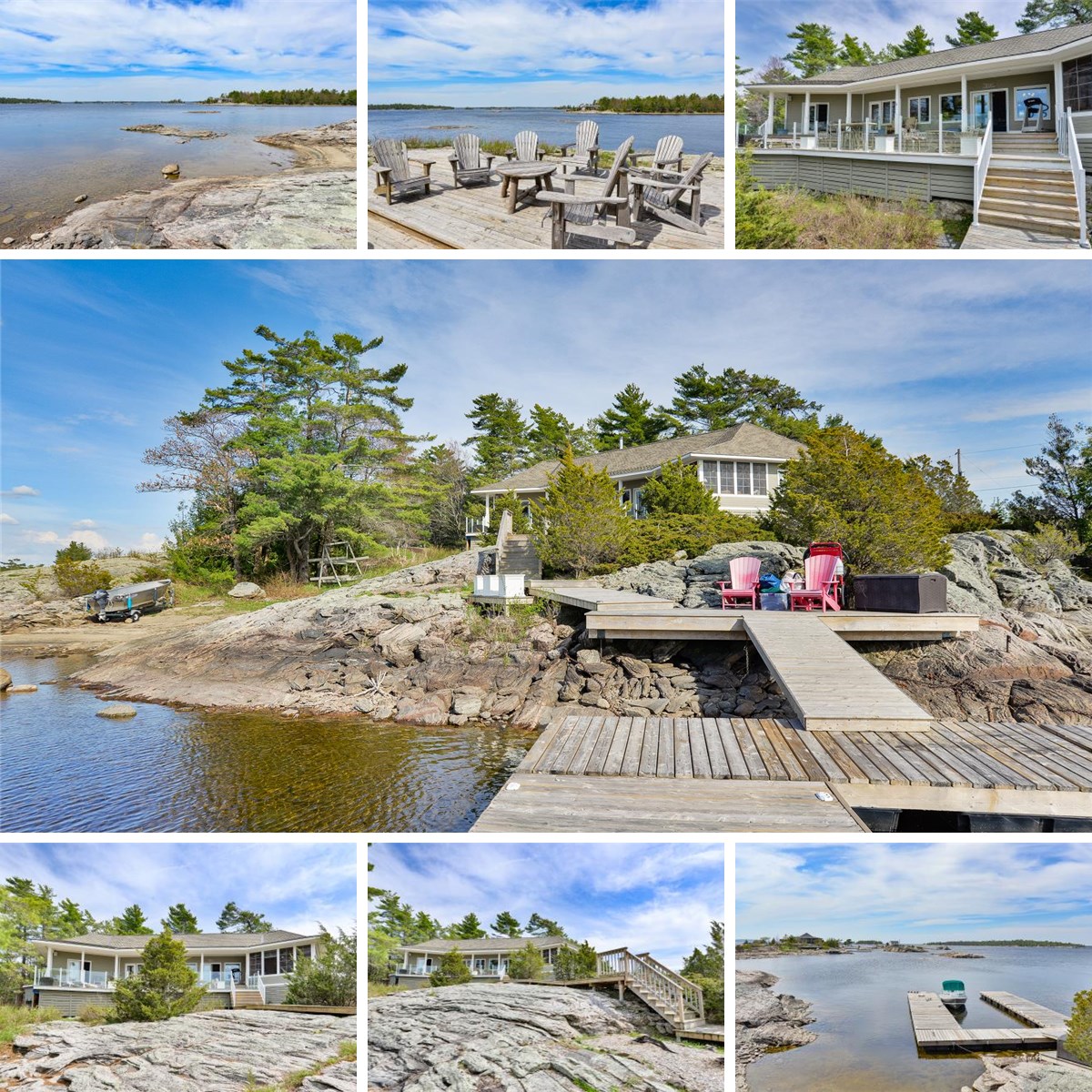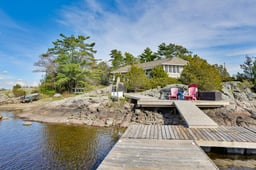 Carved from granite and framed by windswept pines, this stunning island in Georgian Bay's prized Cognashene area offers 520 feet of pristine shoreline and 1.32 acres of timeless natural beauty. The main cottage is anchored by vaulted ceilings, a stone fireplace, and expansive windows that bring the Bay into every room. Hickory hardwood runs throughout, while the Muskoka Room, with its pine flooring and retractable Weatherwall windows, provides a seamless transition between indoors and out, perfect for summer evenings or cozy fall afternoons. The open-concept kitchen offers generous prep space and a walk-in pantry - flowing into a great room designed for gathering with friends and family. The main cottage features three bedrooms and three bathrooms, including a tranquil primary suite with a private ensuite, a guest room with a two-piece bath, and a third bedroom with separate entrance, two queen-sized bunks, and a private three-piece bath. All bathrooms feature heated tile floors. The private 620 sq. ft. guest bunkie provides two additional bedrooms, a sitting area, a shared bath, and its own kitchenette, plus a private deck and hot tub for star-filled evenings. Outdoor living is effortless with an 800 sq. ft. partially covered deck offering panoramic Bay views, and a 400 sq. ft. waterside deck with sun from dawn to dusk. Boaters will love the deep-water dockage at the U-shaped floating dock, with quick access to open water. This timeless retreat is designed for a new family's barefoot luxury and effortless connection to the natural splendour and serenity of the Bay. A spectacular adjoining vacant lot is also available for those seeking extended privacy or future expansion. Just a 15-minute boat ride from the nearest Honey Harbour marina, yet completely removed from the rhythm of everyday life, this rare island offering is more than a cottage. It is a story waiting to be lived in one of Georgian Bay's most coveted areas. Discover the art of island living - perfected.